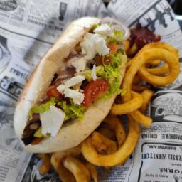 Pan de molletes,Codillo asado, berenjena calabacín zanahoria patata lechuga tomate cebolla pepinillo y salsa yogurt